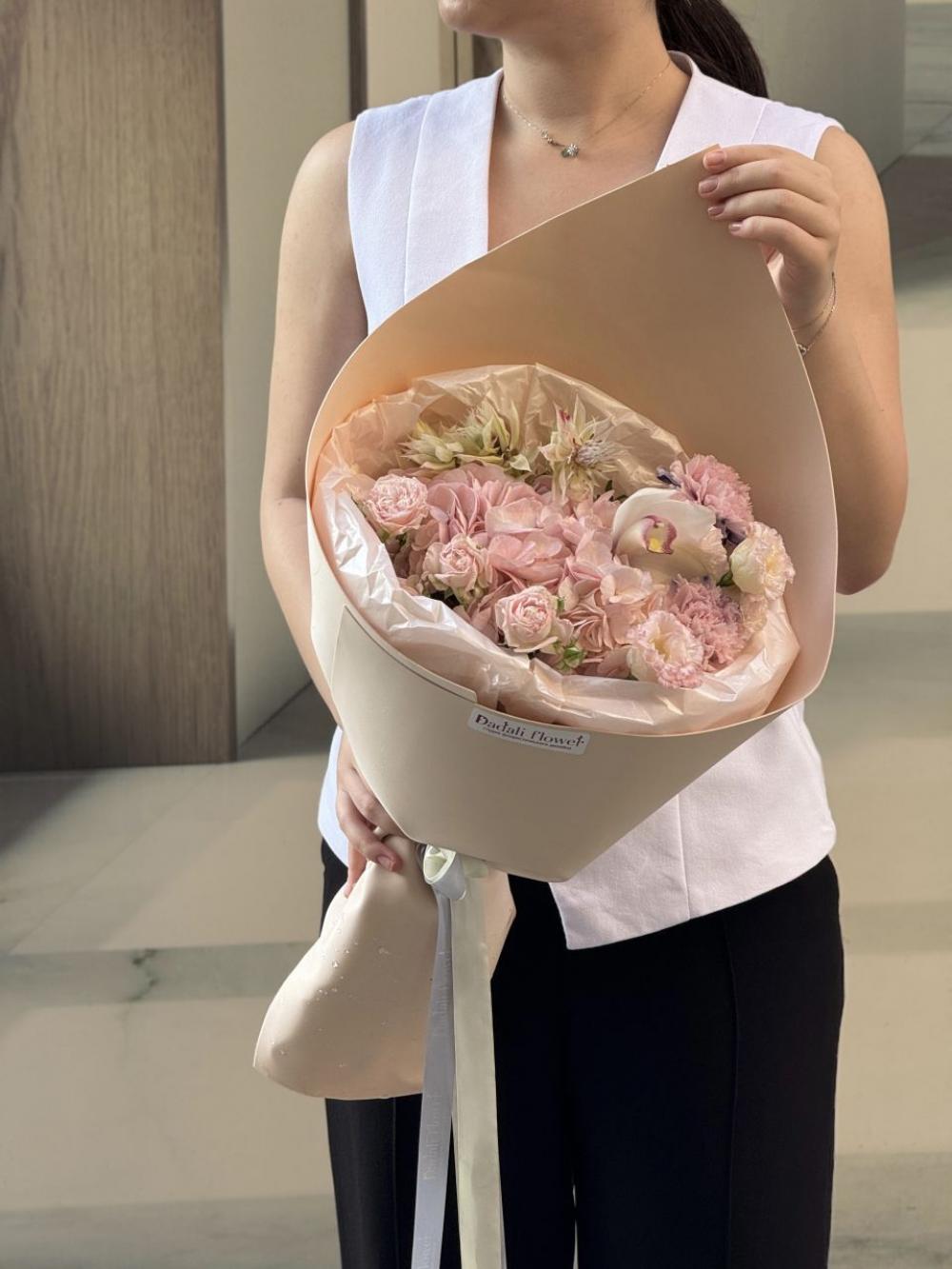На выполнение этой композиции нам понадобится чуть больше времени. Каждый наш букет уникален. Все их невозможно повторить в точности из за сезонности и природной уникальности внешнего вида каждого цветка. Но мы сохраним размер, атмосферу и стилистику. Если вы хотите выбрать готовую композицию, рекомендуем перейти в раздел Онлайн-Витрины