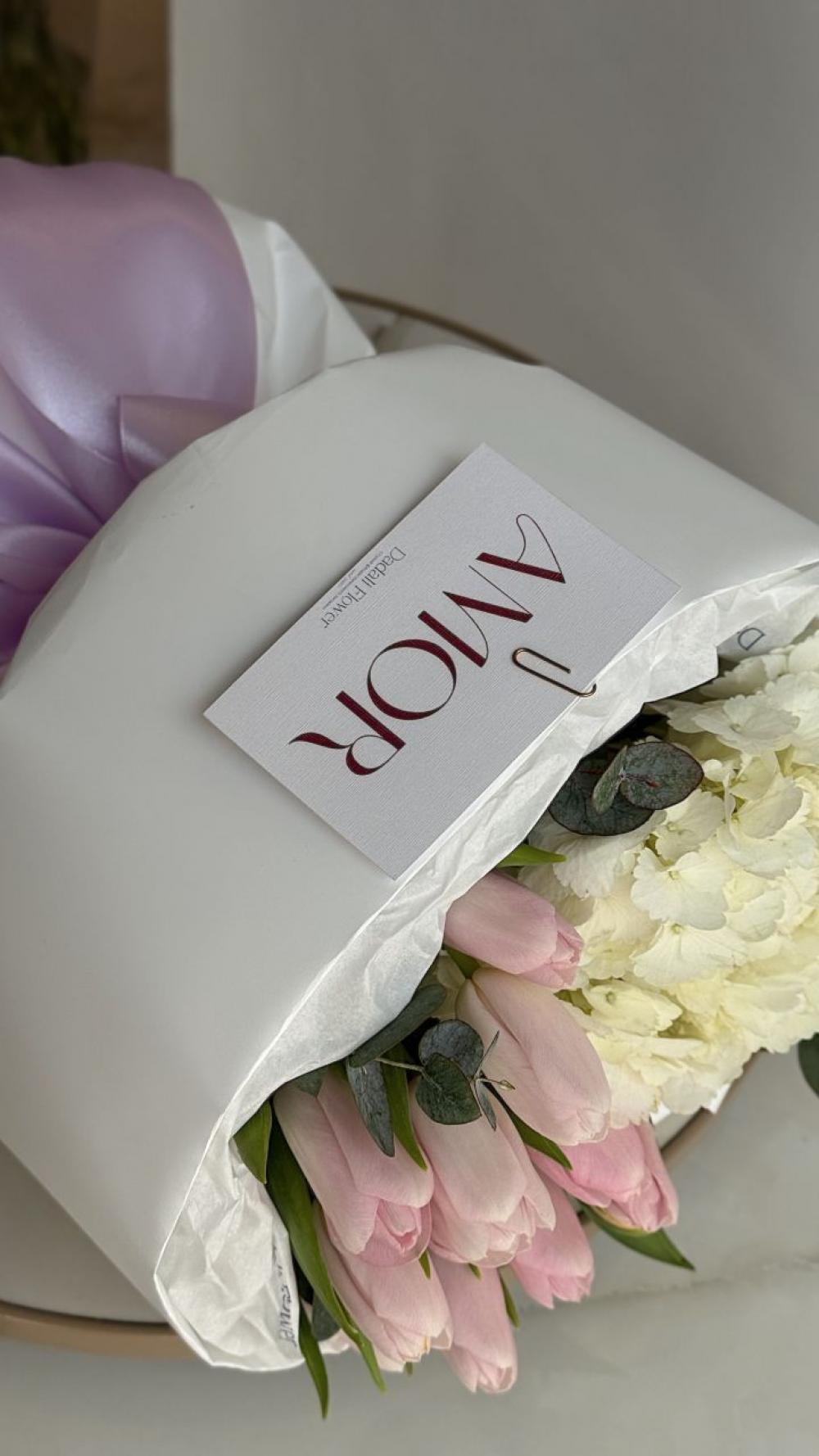Букет с гортензией и тюльпанами