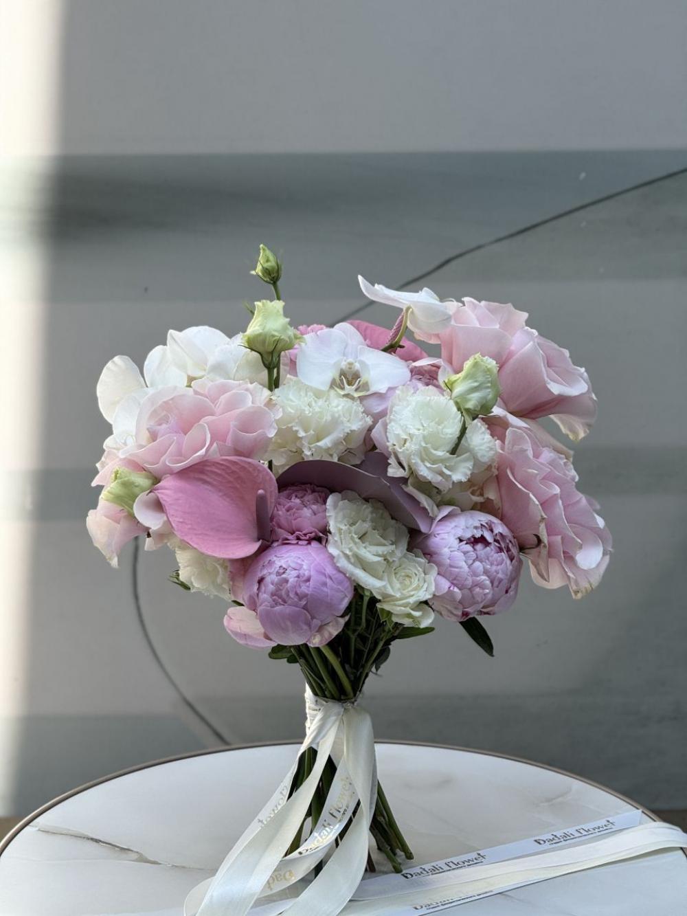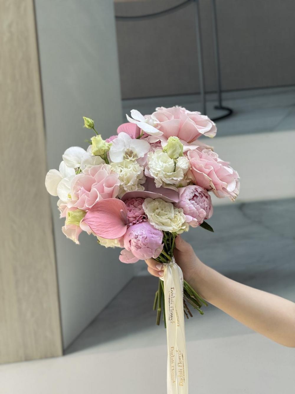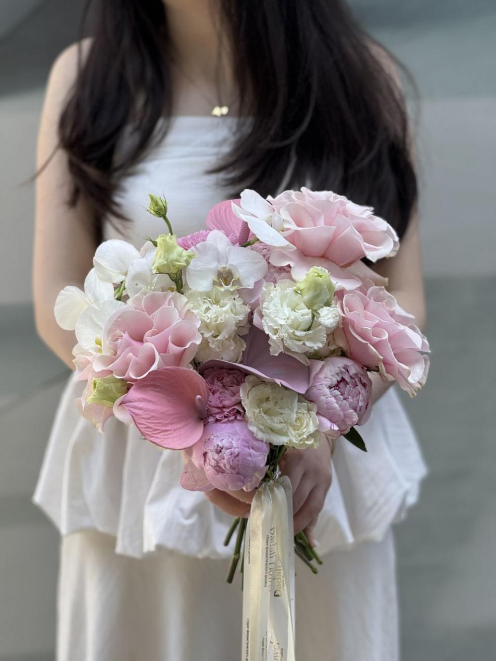 Букет невесты в раскидистом стиле с пионами, антуриумом, орхидеей, французскими розами и эустомой