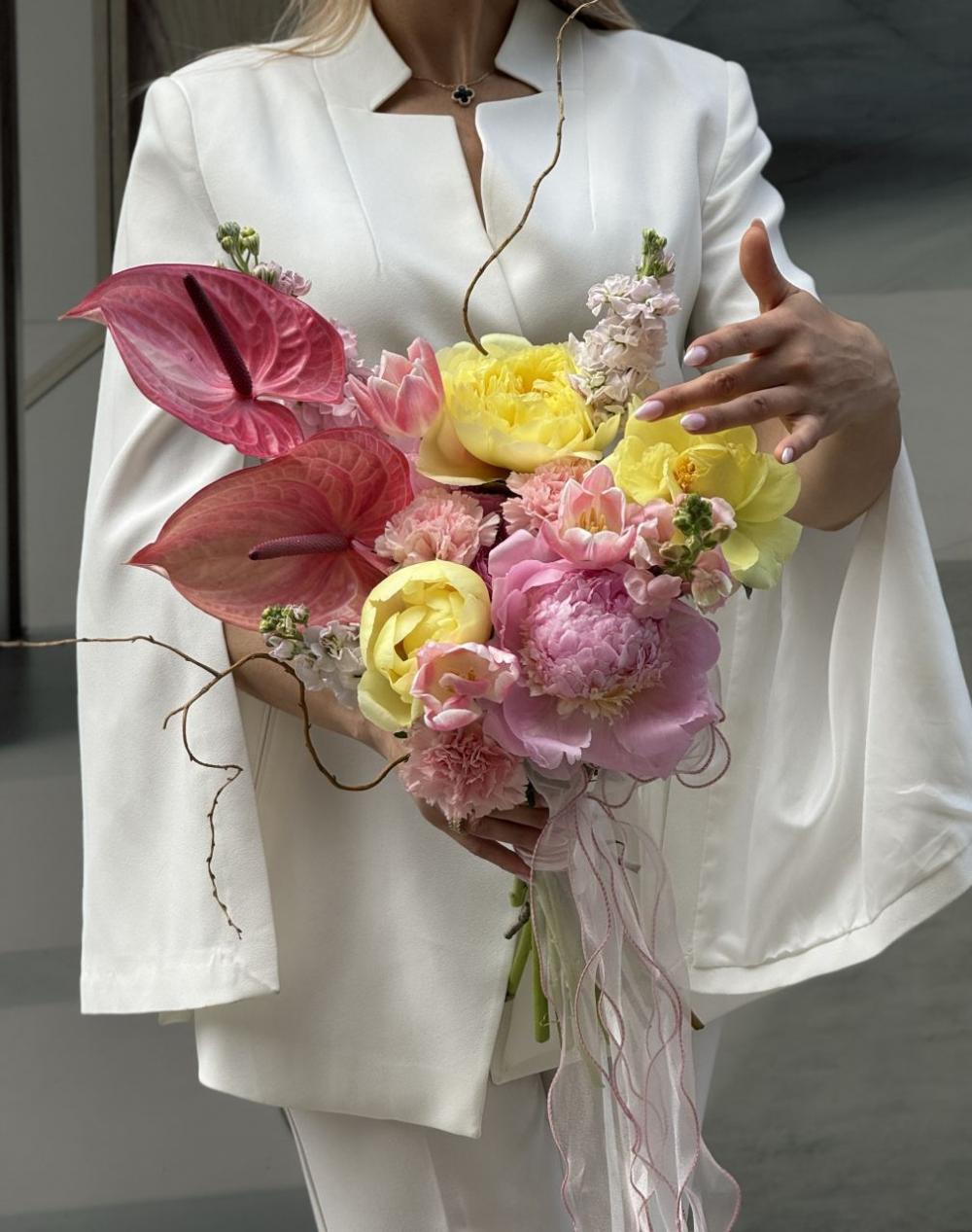 Яркий букет невесты в тресковом исполнении с лимонными и розовыми пионами, антуриумом, , диантусом, матиолой с добавлением веток вишни
