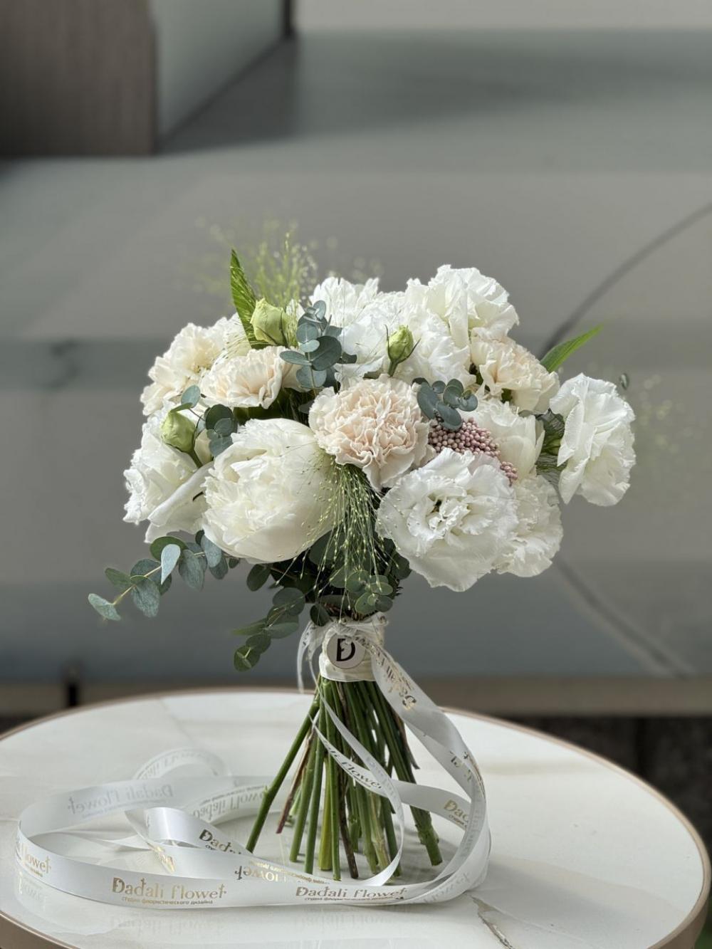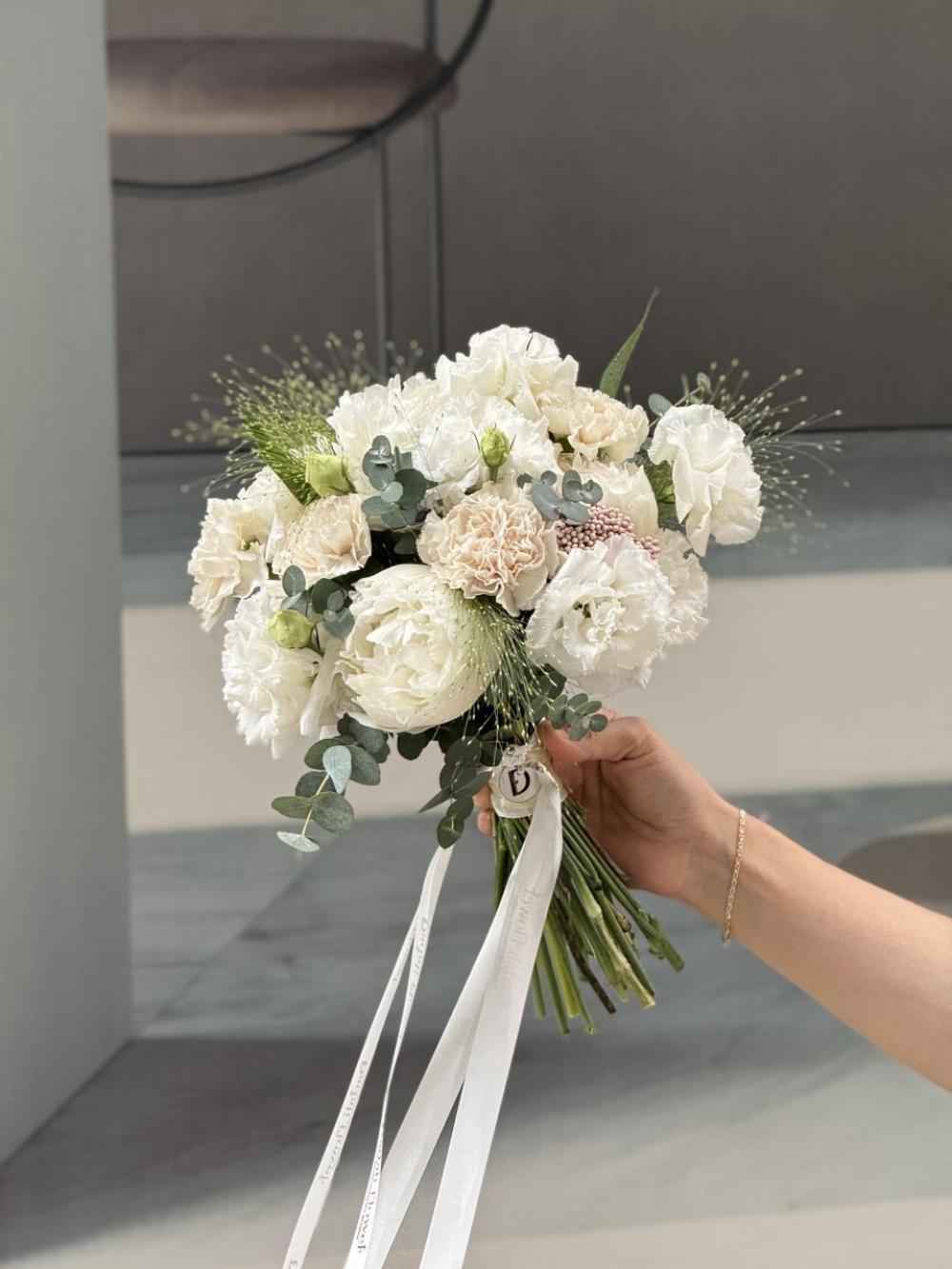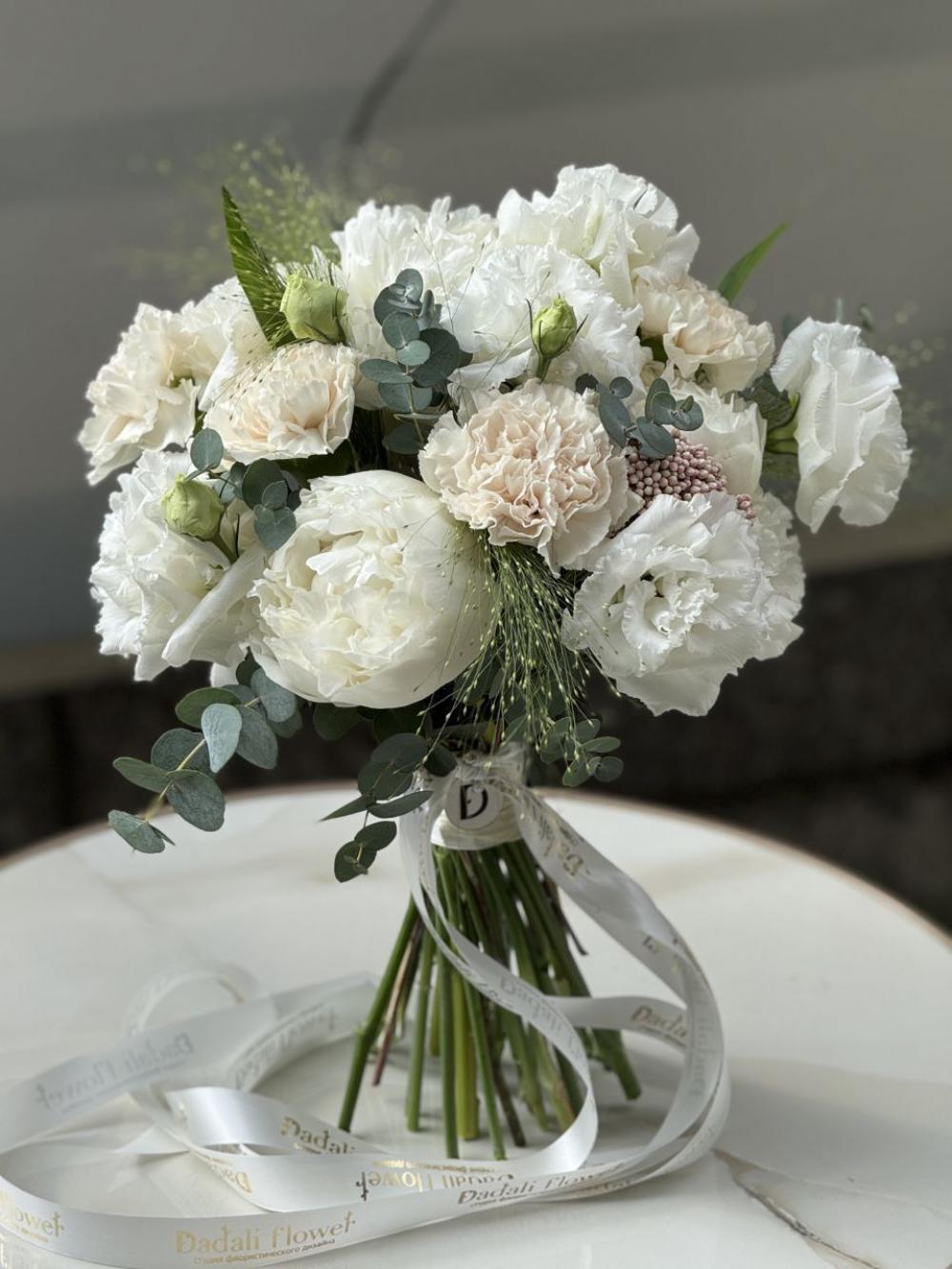 Букет невесты в классическом исполнении с белыми пионами, диантусами, эустомой и эвкалиптом