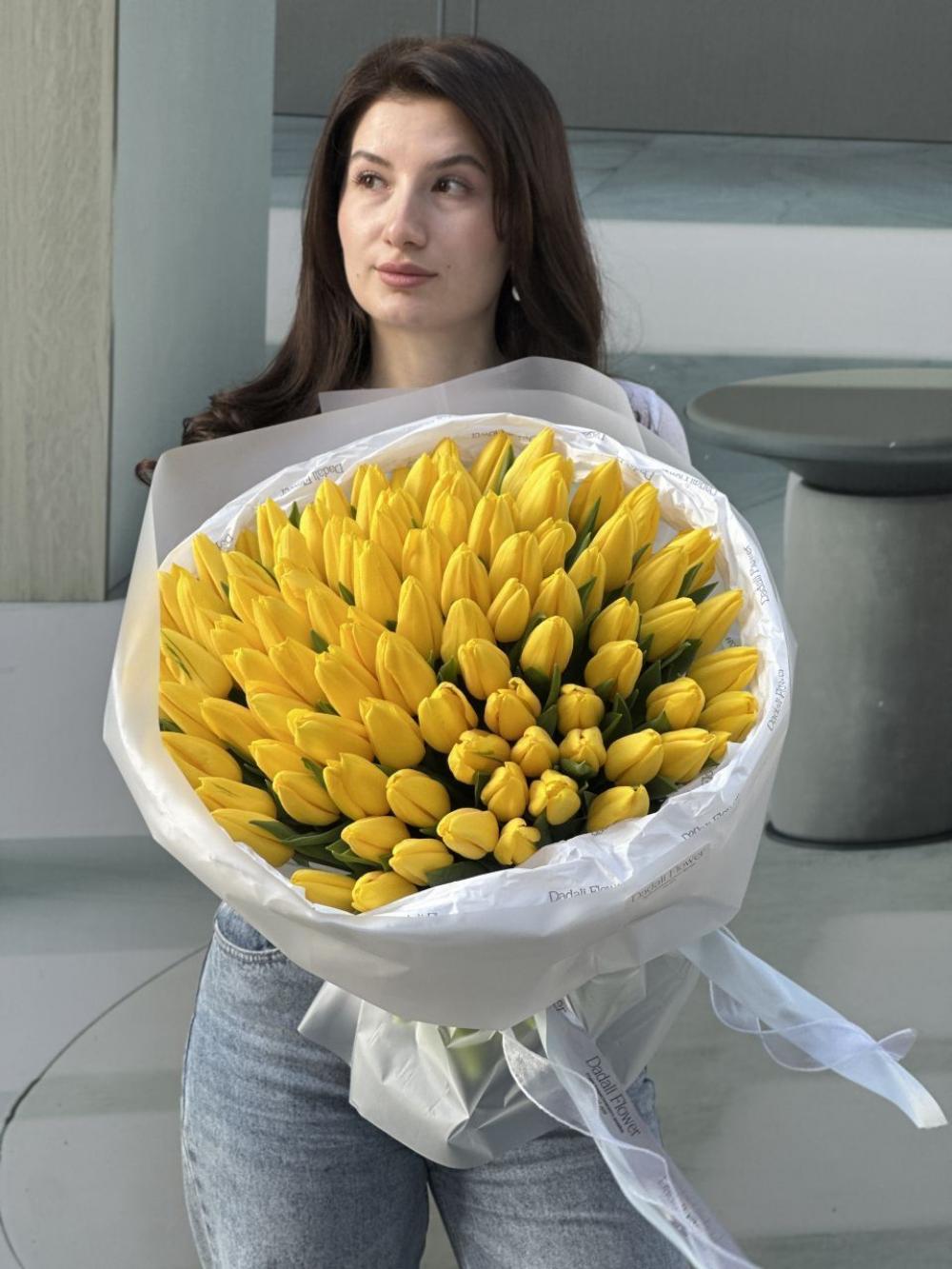 Этот букет из 101 тюльпана желтого цвета - само воплощение радости и весеннего пробуждения. Лаконичные и в то же время изысканные, тюльпаны словно нашептывают о самых искренних чувствах, наполняя пространство свежестью и легким, едва уловимым ароматом первой Весны. Вы всегда можете заказать такой букет в нашем салоне. Уточнение по цвету и наличию у наших менеджеров по тел.89280817005 .
