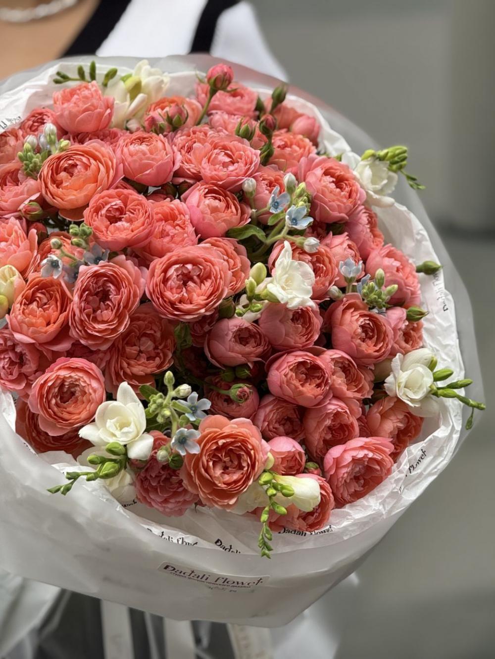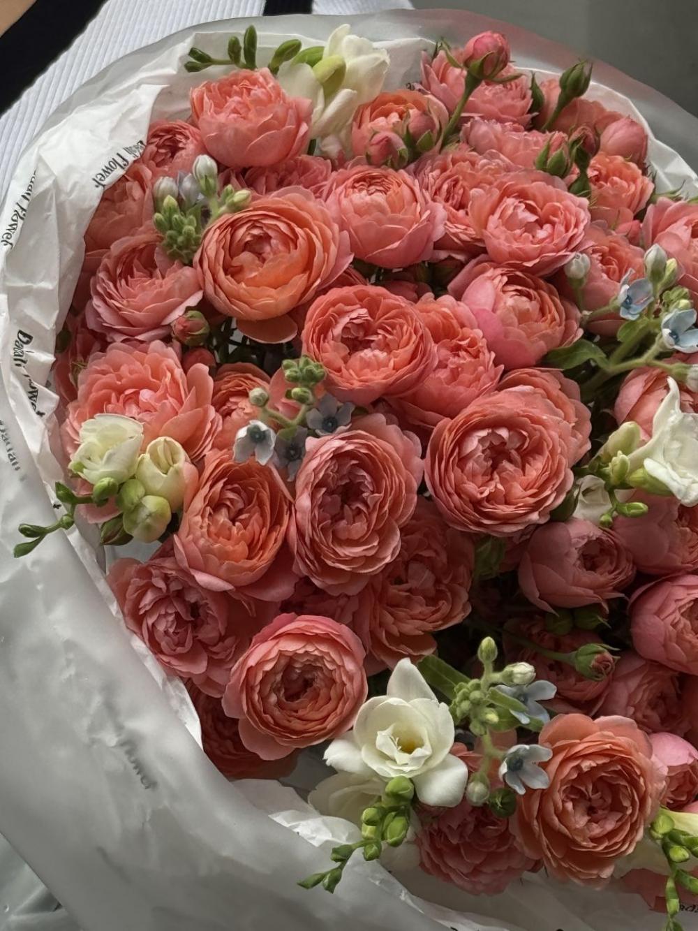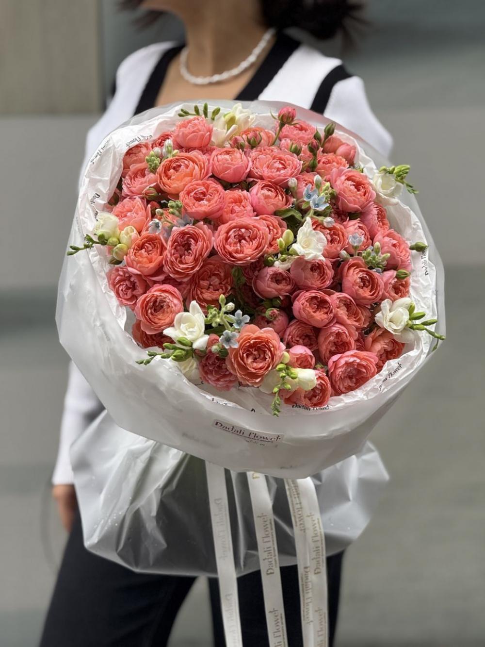 На выполнение этой композиции нам понадобится чуть больше времени. Каждый наш букет уникален. Все их невозможно повторить в точности из за сезонности и природной уникальности внешнего вида каждого цветка. Но мы сохраним размер, атмосферу и стилистику. Если вы хотите выбрать готовую композицию, рекомендуем перейти в раздел Онлайн-Витрины