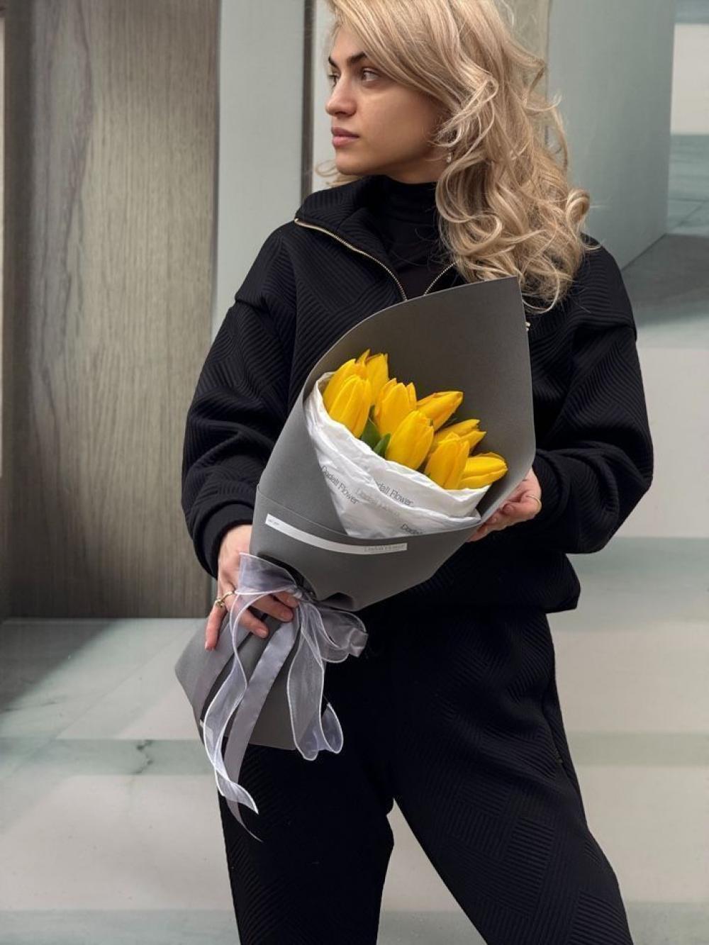 Букет из 9 тюльпанов желтого цвета в упаковке. Этот букет - само воплощение Весны, замершее в нежных лепестках. Магия этих цветов в том, как они продолжают расти и менять свои изгибы прямо в вазе. Вы всегда можете заказать такой букет на нашем сайте, цвет можно подобрать с менеджером по номеру телефона .