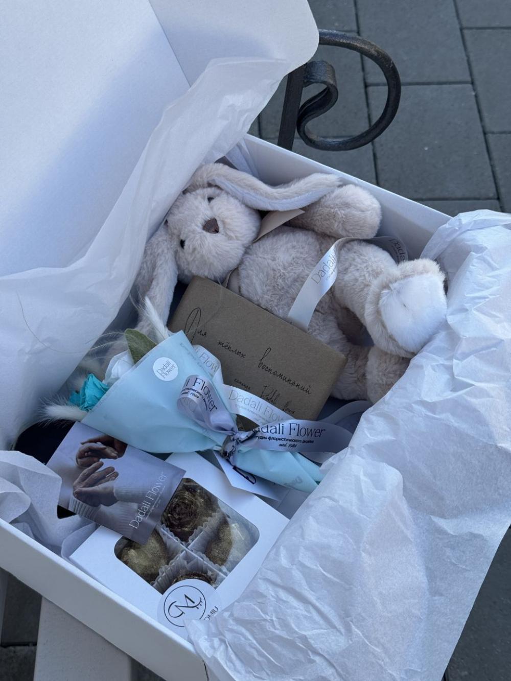 Flower-box бирюза: -шоколадные конфеты -ароматическая свеча -букет из сухоцветов -игрушка -антистресс -блокнот для воспоминаний