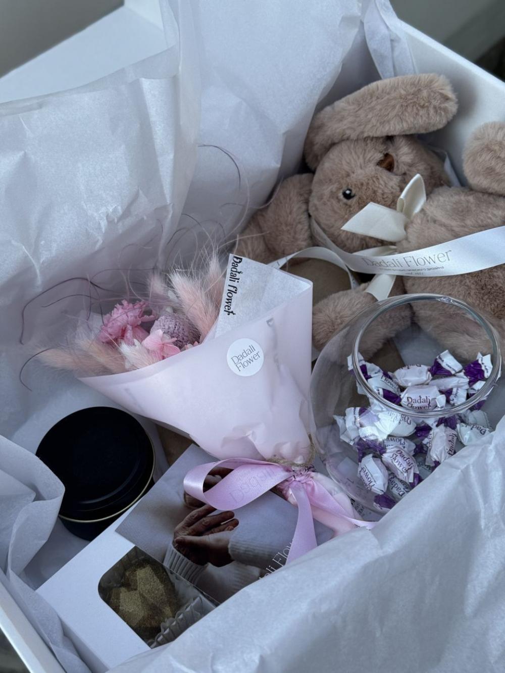 Flower-box розовый: -шоколадные конфеты -ароматическая свеча -букет из сухоцветов -игрушка -антистресс -стеклянная ваза -леденцы -блокнот для воспоминаний