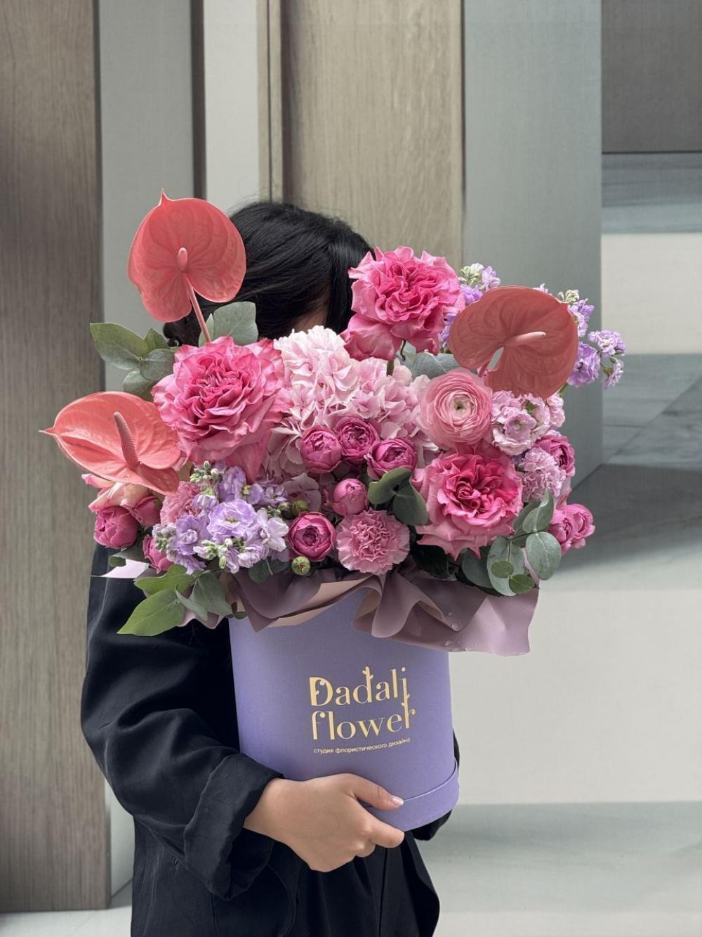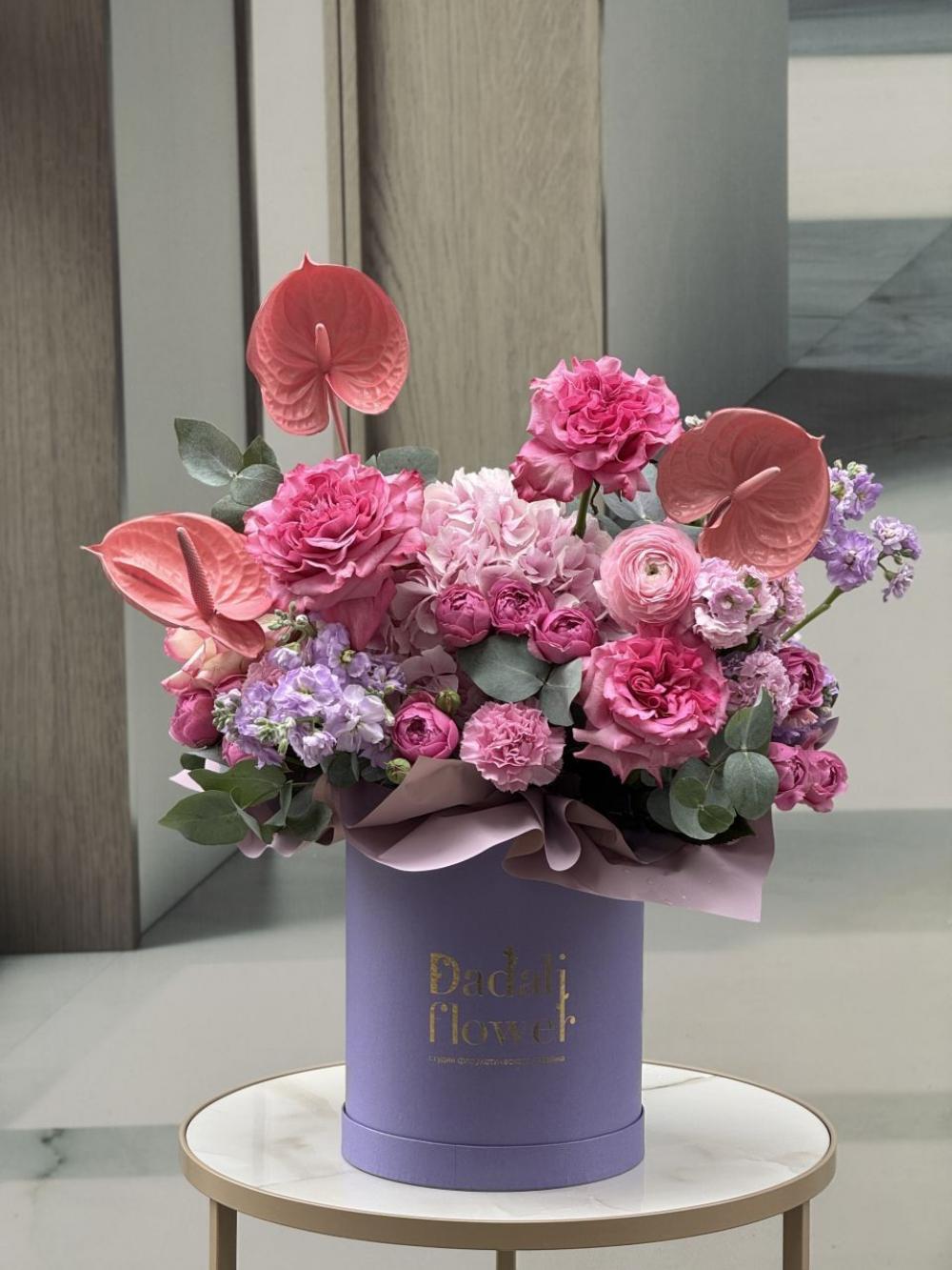 Яркая композиция в шляпной коробке с антуриумом, гортензией и розами-Кантри