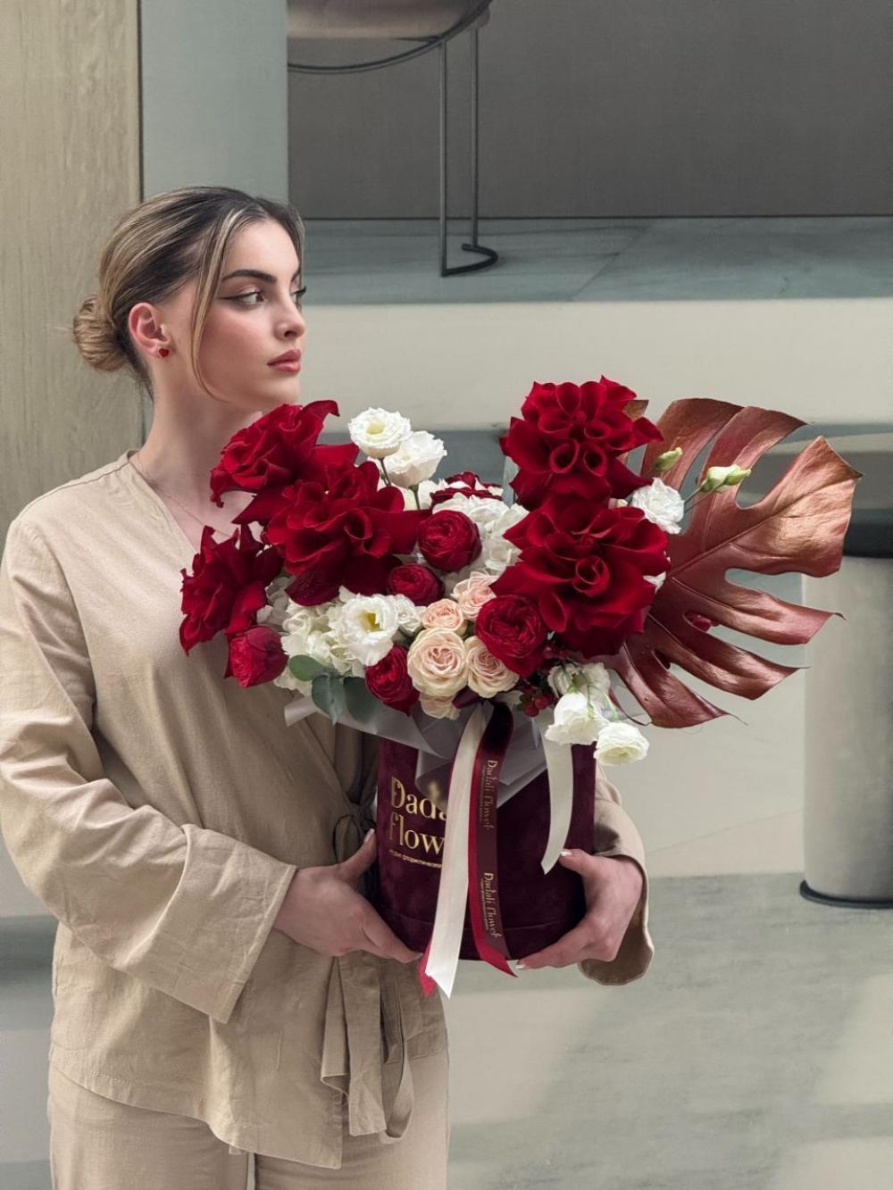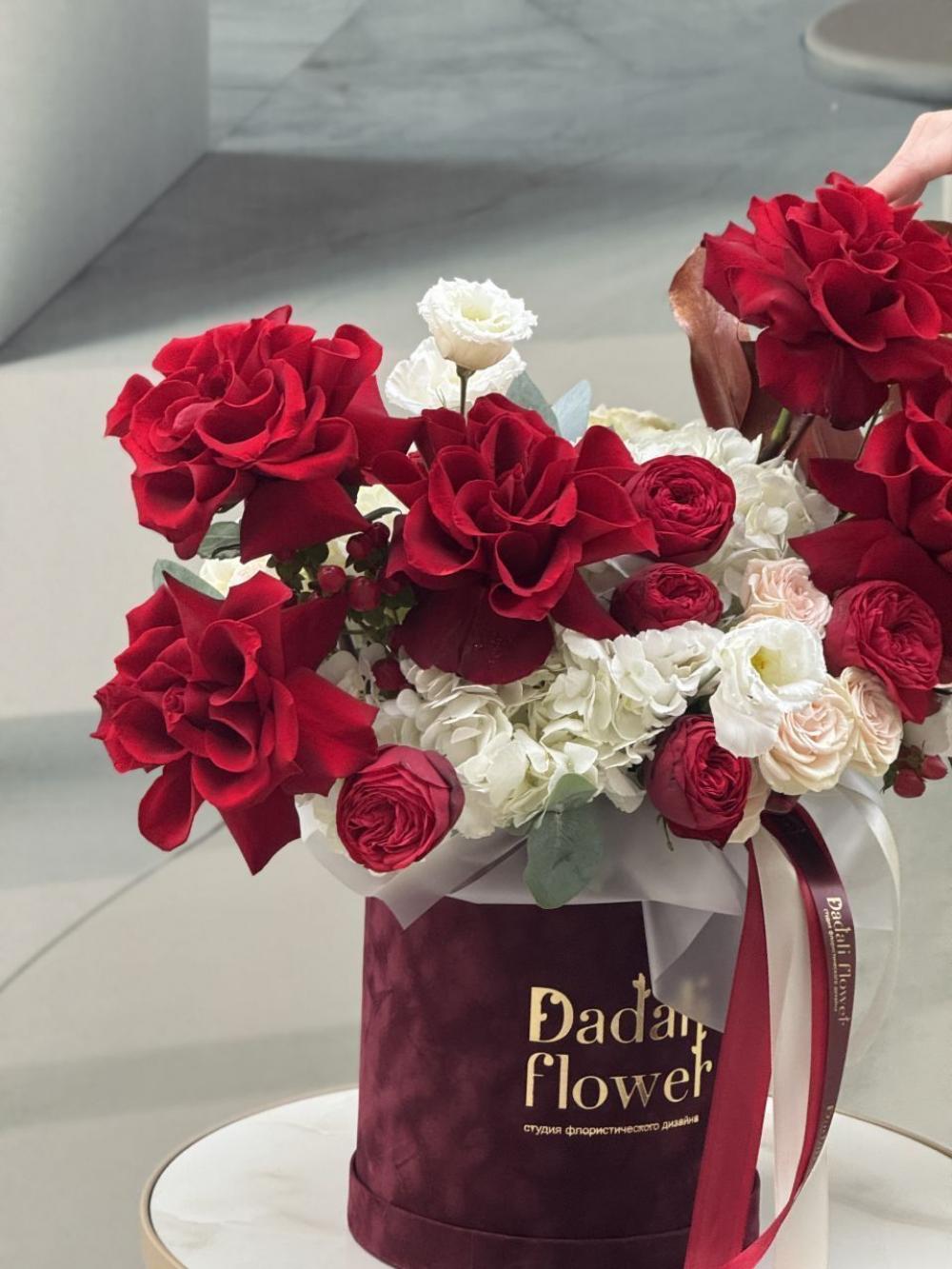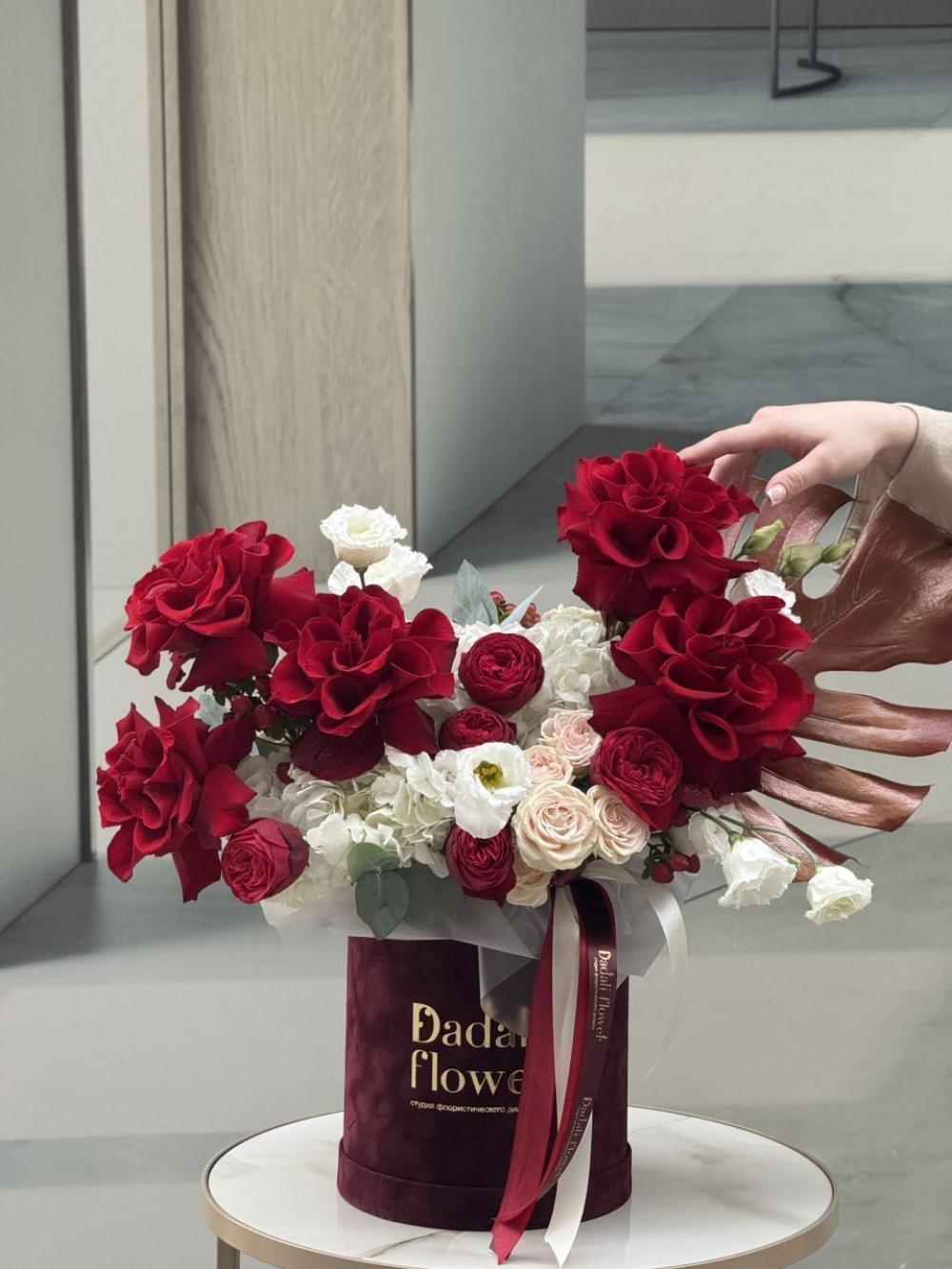 Композиция в шляпной коробке с красными французскими розами