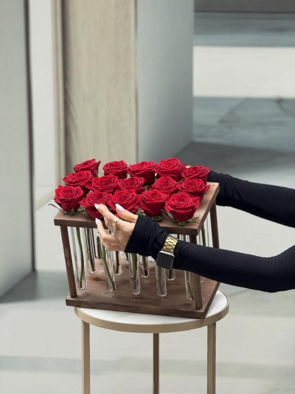 15 роз в боксе с колбами , очень красивы и удобный поодарок для юбимой. Розы уже стоят в колбах с водой и будут долго радовать своей красотой!