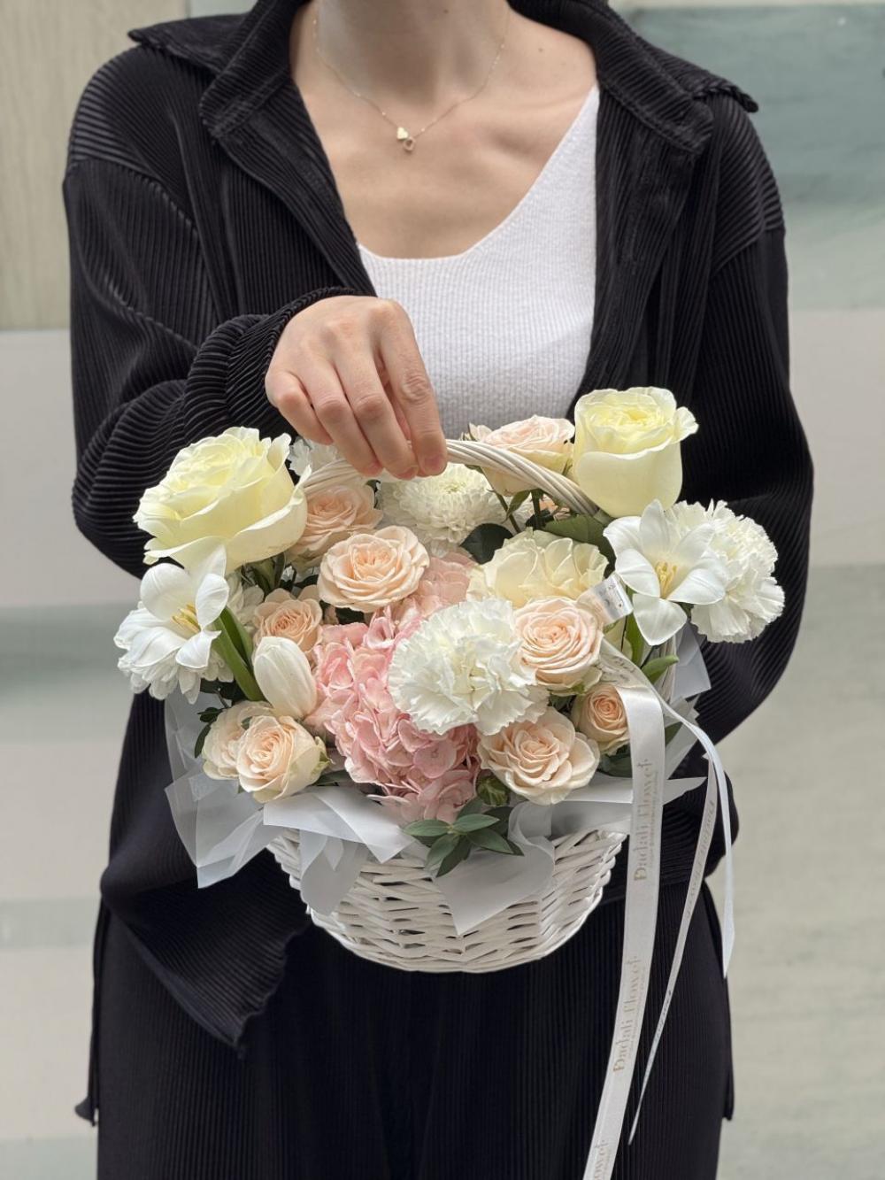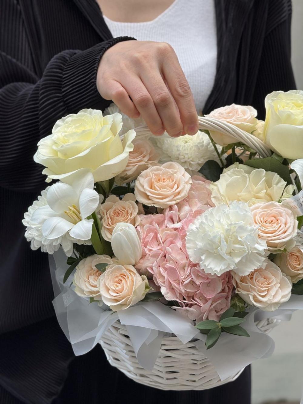 сборная корзина в пломбирных оттенках с эквадорскими розами, эустомой и гортензией